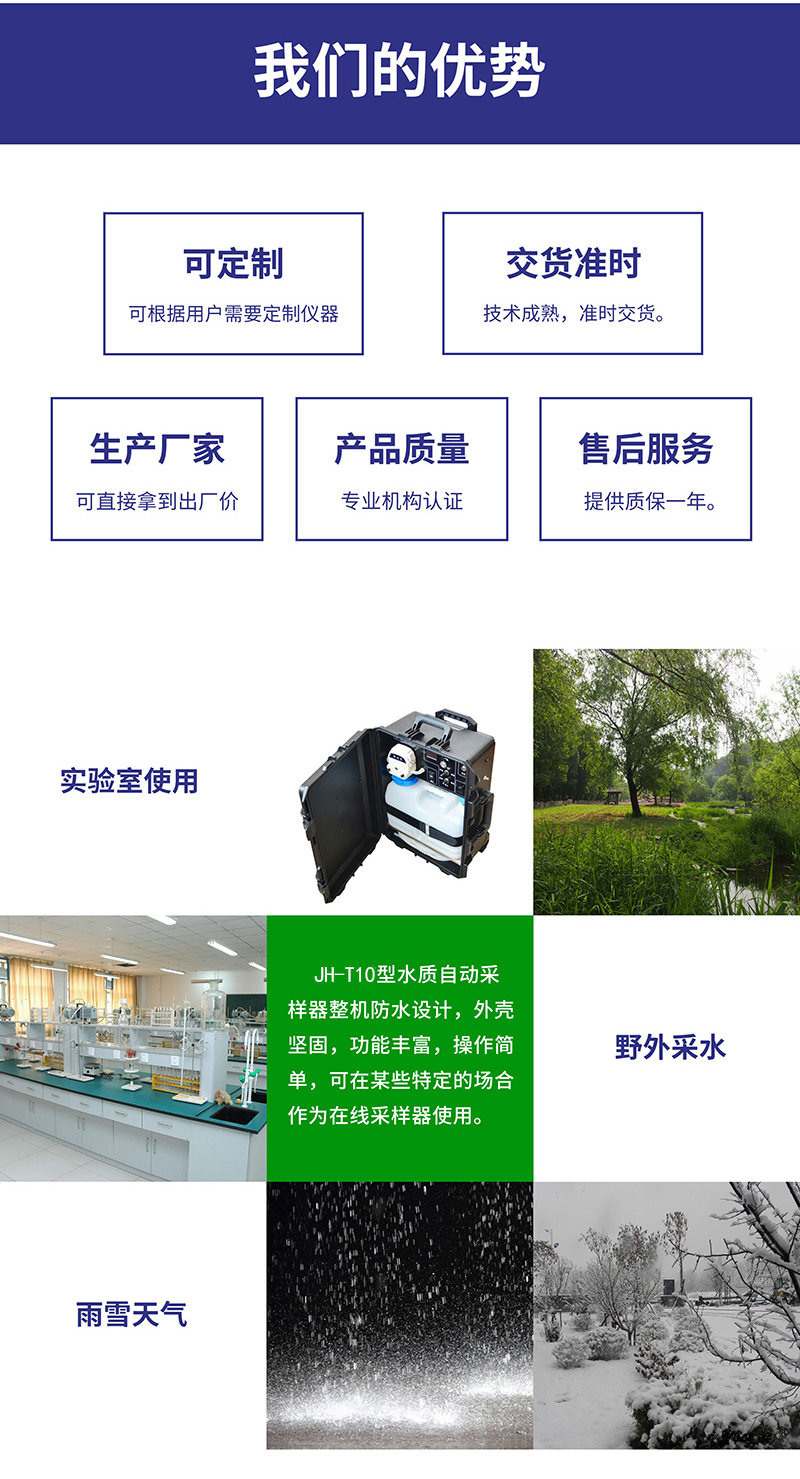 JH-T10水質(zhì)自動采樣器整機防水設(shè)計,外殼堅固,功能豐富,操作簡單,可全天候應(yīng)用,無需有復(fù)雜的專業(yè)知識,該產(chǎn)品非常方便用戶便攜應(yīng)用,亦可在某些特定的場合作為在線采樣器使用,性價比高,滿足用戶的應(yīng)用需求。