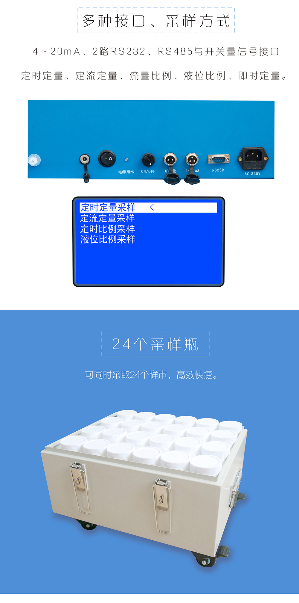 2.多種采樣功能:定時(shí)定量采樣、定流定量采樣、流量比例采樣、液位比例采樣、即時(shí)定量采樣。